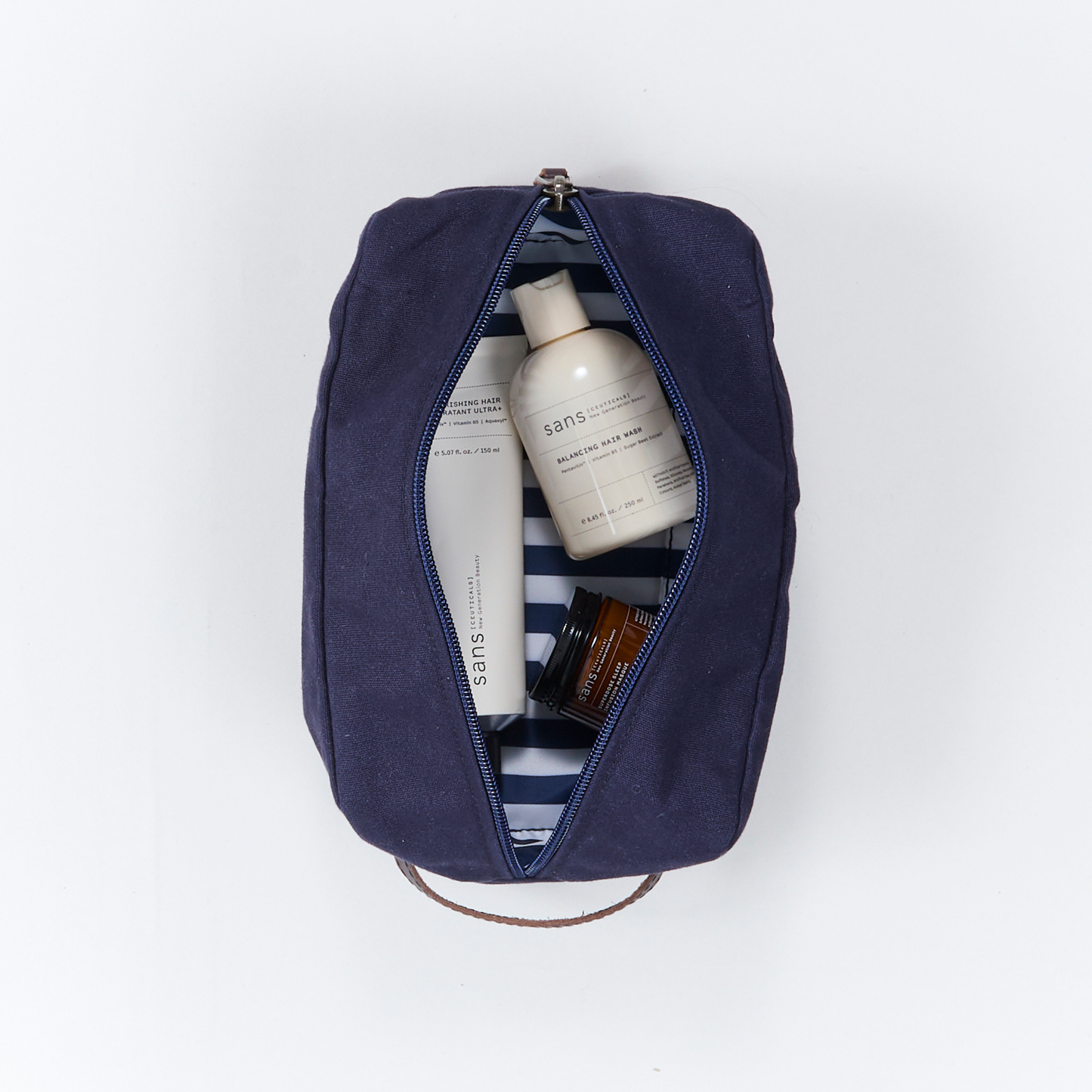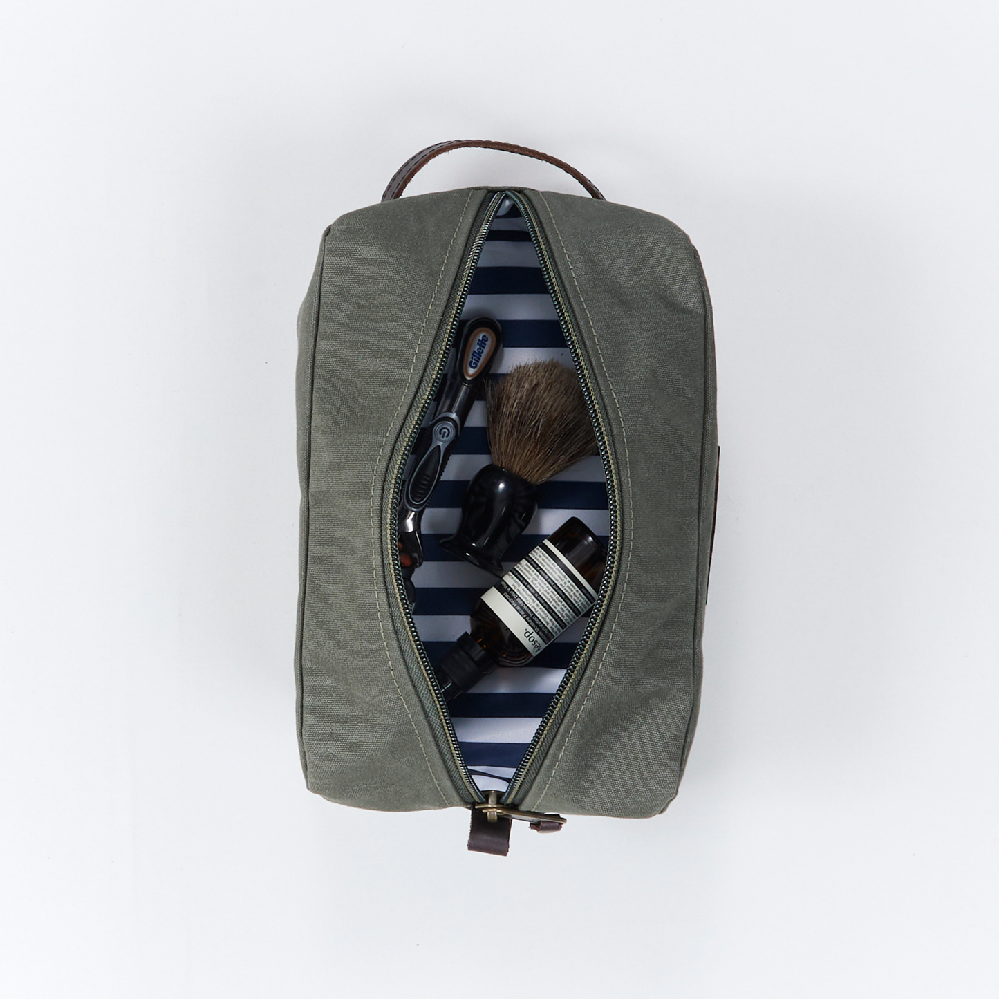 A practical travel essential, this classic sponge bag features a sturdy leather carry handle, a spacious main compartment, and a separate internal pocket for easy organisation. Lined with wipeable navy and white striped fabric, it’s a durable, timeless choice for keeping your essentials neatly stored while traveling.